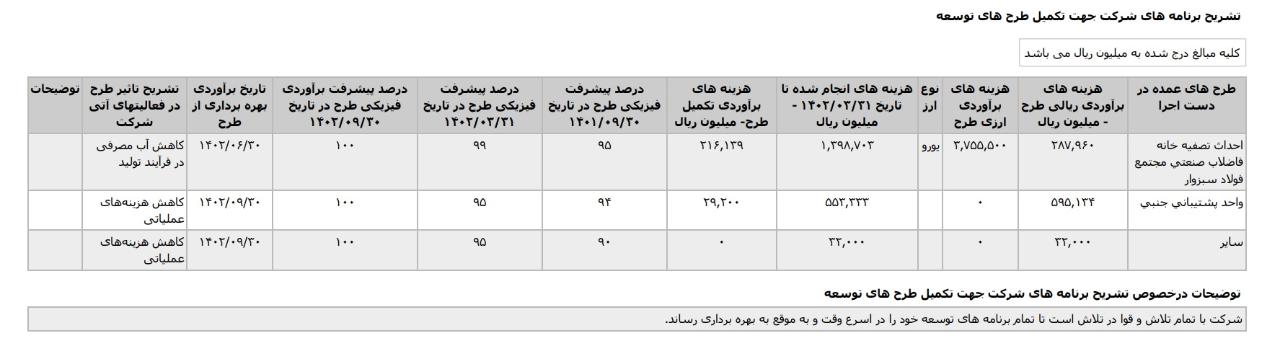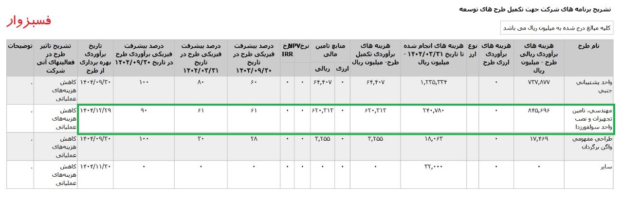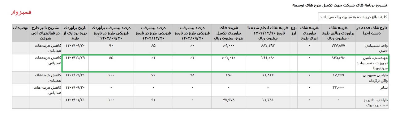 *مهندسی، تامین تجهیزات و نصب واحد سولفورزدا ،با هزینه ی برآوردی تکمیل طرح معادل 60 میلیارد تومان که تاریخ برآوردی بهره برداری از طرح بهمن 1404 اعلام شده است.