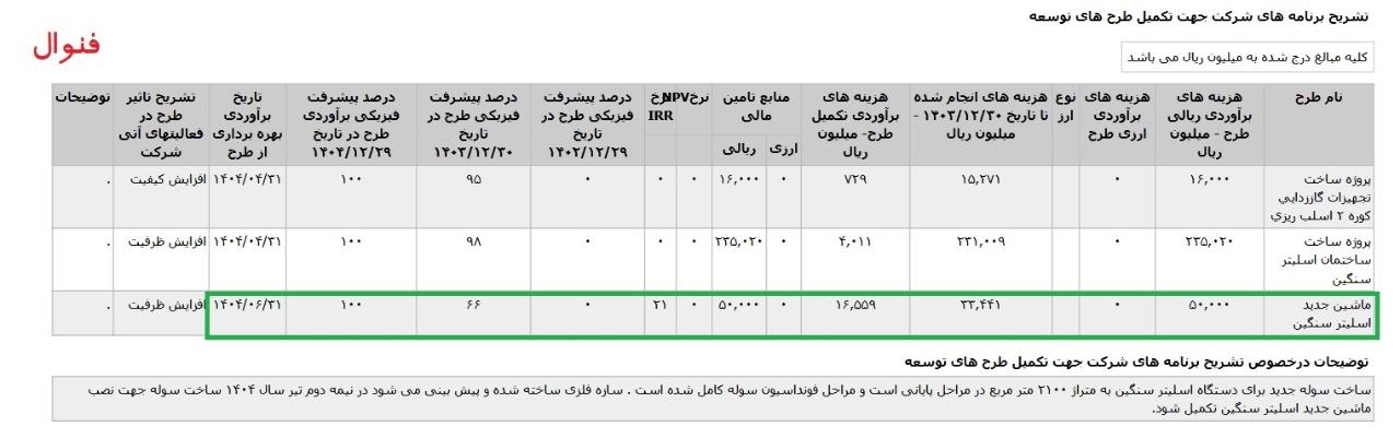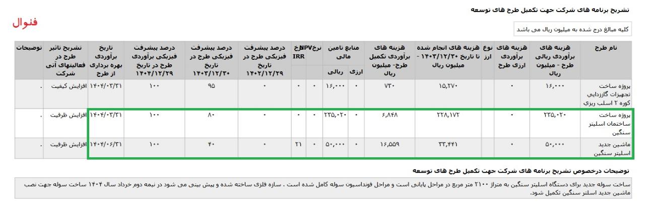 *ماشین جدید اسليتر سنگين ،با هزینه ی برآوردی تکمیل طرح معادل 2 میلیارد تومان که تاریخ برآوردی بهره برداری از طرح دی ماه 1404 اعلام شده است.