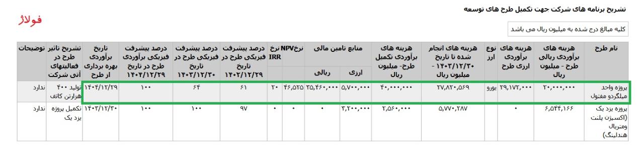 *پروژه واحد ميلگردو مفتول ،با هزینه ی برآوردی تکمیل طرح معادل 4.307 میلیارد تومان که تاریخ برآوردی بهره برداری از طرح شهریور1405 اعلام شده است.