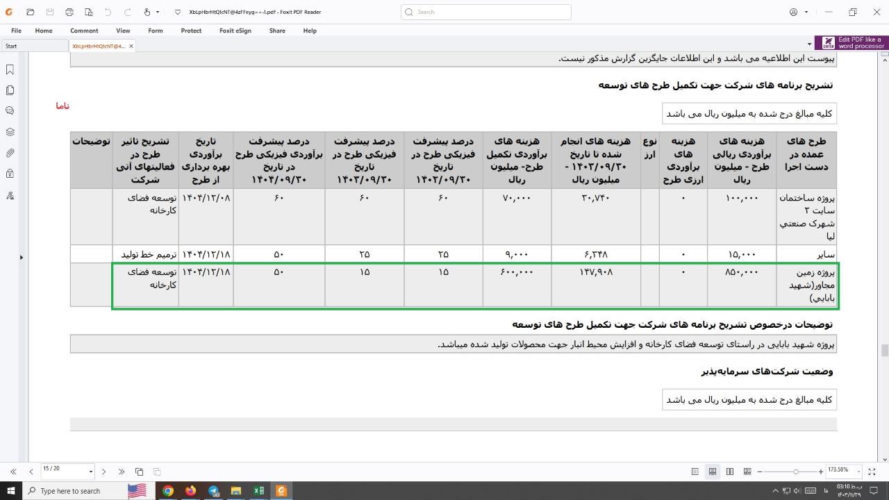 *پروژه زمين مجاورشهيد بابايي ، با هزینه ی برآوردی تکمیل طرح معادل 85 میلیارد تومان که تاریخ برآوردی بهره برداری از طرح در تیر1406 اعلام شده است.