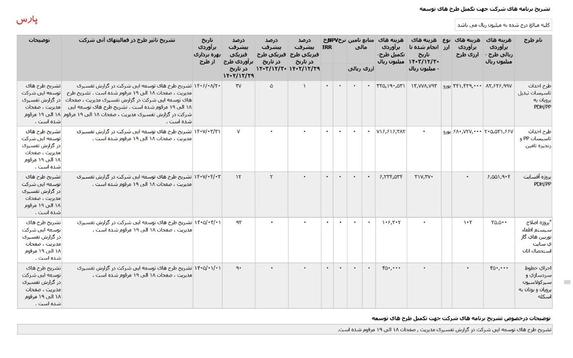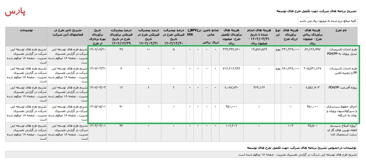 *طرح احداث تاسيسات تبديل پروپان به PDH-PP ،با هزینه ی برآوردی تکمیل طرح معادل 34697 میلیارد تومان که تاریخ برآوردی بهره برداری از طرح در تیر 1406 اعلام شده است.