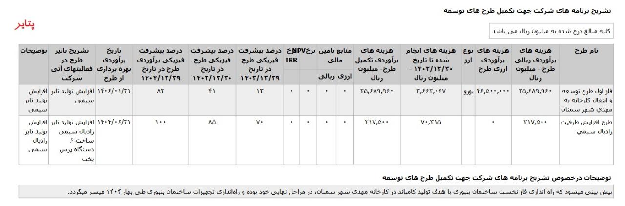 * فاز دوم طرح افزایش ظرفیت کارخانه سمنان،با هزینه ی برآوردی تکمیل طرح معادل 687 میلیارد تومان که تاریخ برآوردی بهره برداری از طرح تیر1406 اعلام شده است.