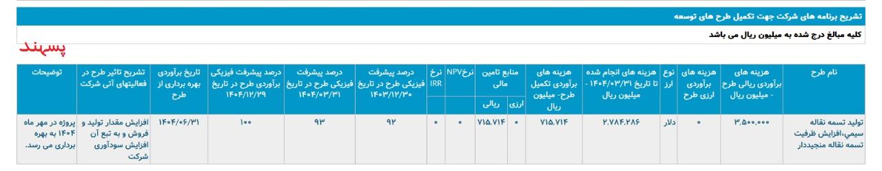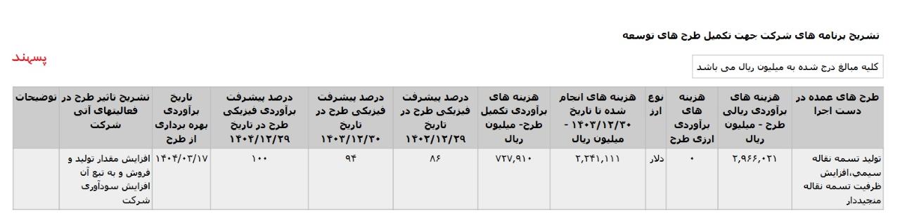 * توليد تسمه نقاله سيمي،افزايش ظرفيت تسمه نقاله منجيددار ،با هزینه ی برآوردی تکمیل طرح معادل 162 میلیارد تومان که تاریخ برآوردی بهره برداری از طرح در اسفند 1404 اعلام شده است.