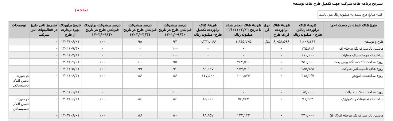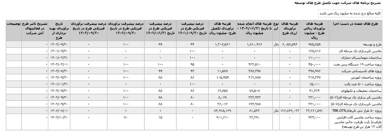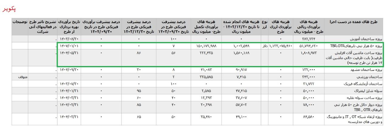 * پروژه ساخت ماشين آلات افزايش ظرفيت- بابت ظرفيت خالي ماشين آلات ۱۴ هزار تن طرح توسعه، با هزینه ی برآوردی تکمیل طرح معادل 4 میلیارد تومان که تاریخ برآوردی بهره برداری از طرح در آبان1404 اعلام شده است.