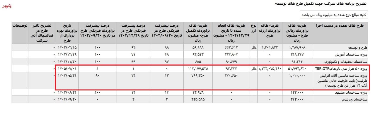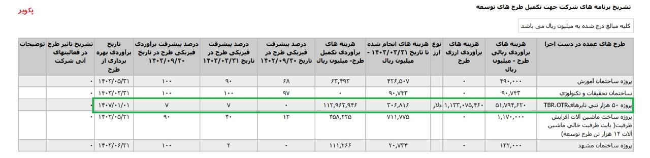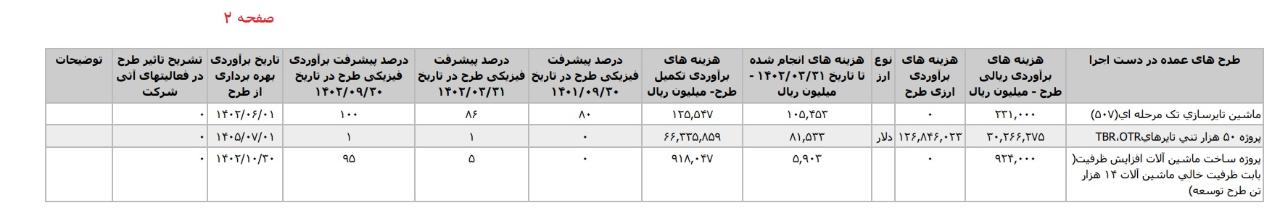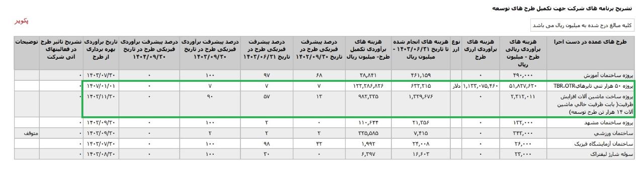 *پروژه ۵۰ هزار تني تايرهايTBR،OTR،با هزینه ی برآوردی تکمیل طرح معادل 16.016 میلیارد تومان که تاریخ برآوردی بهره برداری از طرح در فروردین1408 اعلام شده است.