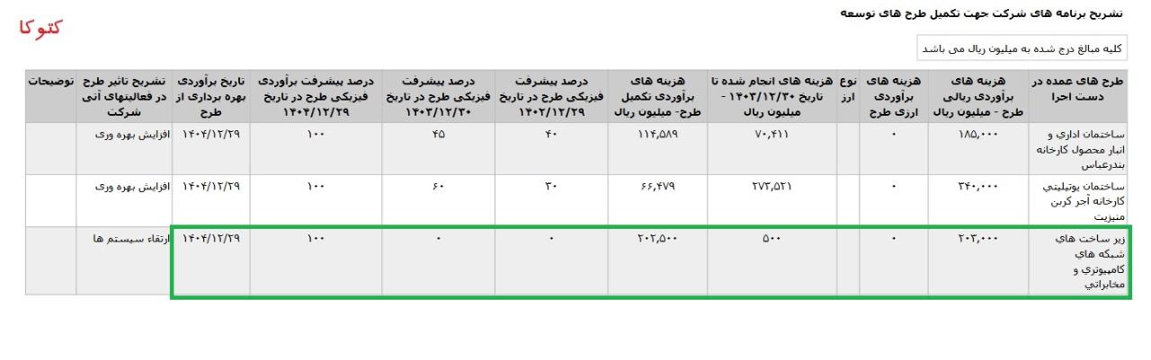*زير ساخت هاي شبکه هاي کامپيوتري و مخابراتي ،با هزینه ی برآوردی تکمیل طرح معادل 3 میلیارد تومان که تاریخ برآوردی بهره برداری از طرح در اسفند 1405 اعلام شده است.