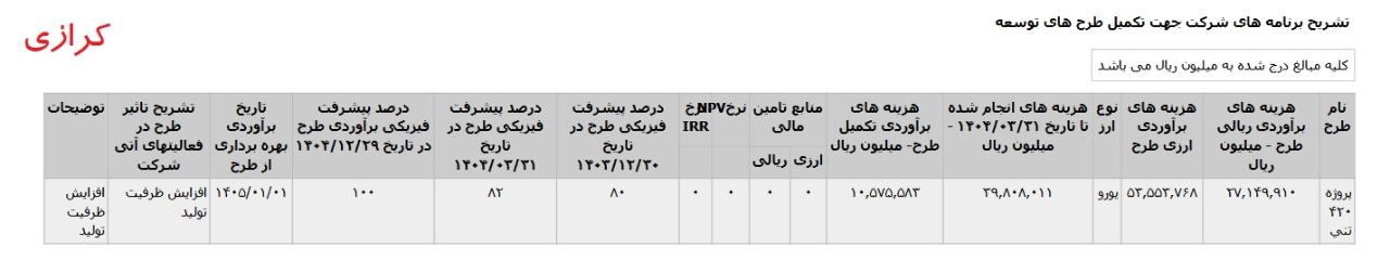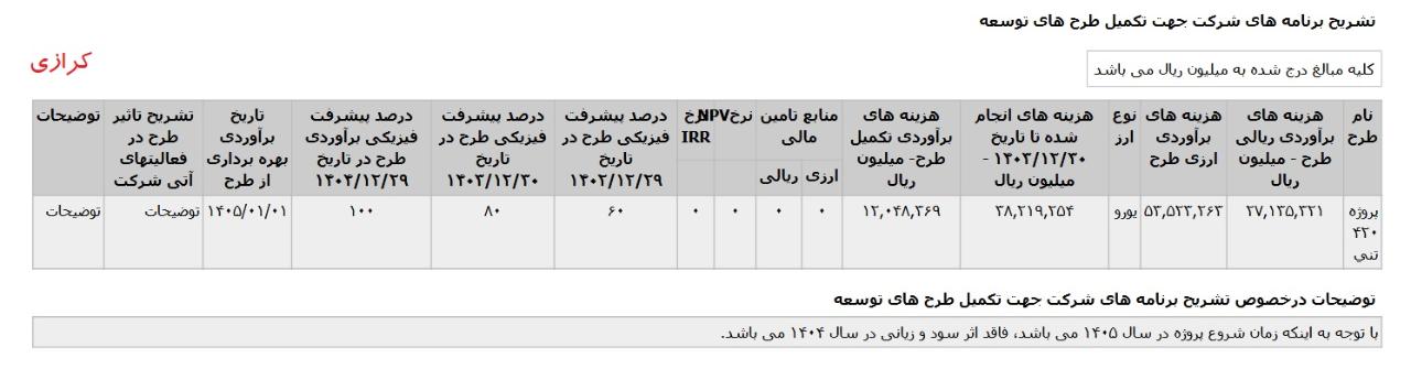 *پروژه ۴۲۰ تني ،با هزینه ی برآوردی تکمیل طرح معادل 1.699 میلیارد تومان که تاریخ برآوردی بهره برداری از طرح شهریور 1405 اعلام شده است.