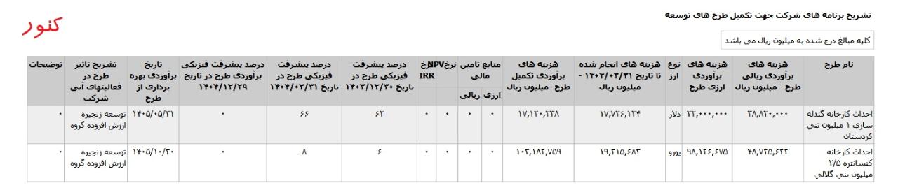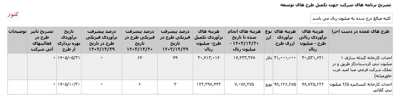 *احداث کارخانه گندله سازي ۱ ميليون تني کردستان ،با هزینه ی برآوردی تکمیل طرح معادل 1.879میلیارد تومان که تاریخ برآوردی بهره برداری از طرح مرداد 1405 اعلام شده است.