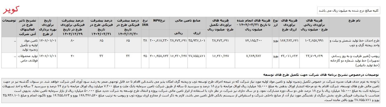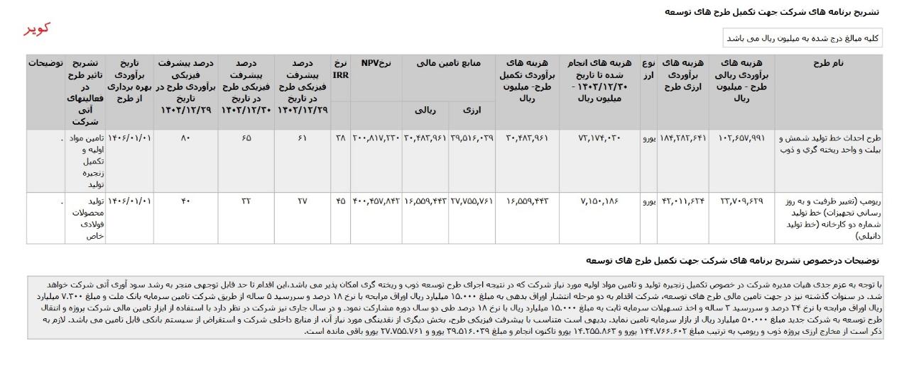 *طرح احداث خط توليد شمش و بيلت و واحد ريخته گري و ذوب ،با هزینه ی برآوردی تکمیل طرح معادل 2.607 میلیارد تومان که تاریخ برآوردی بهره برداری از طرح فروردین 1406 اعلام شده است.