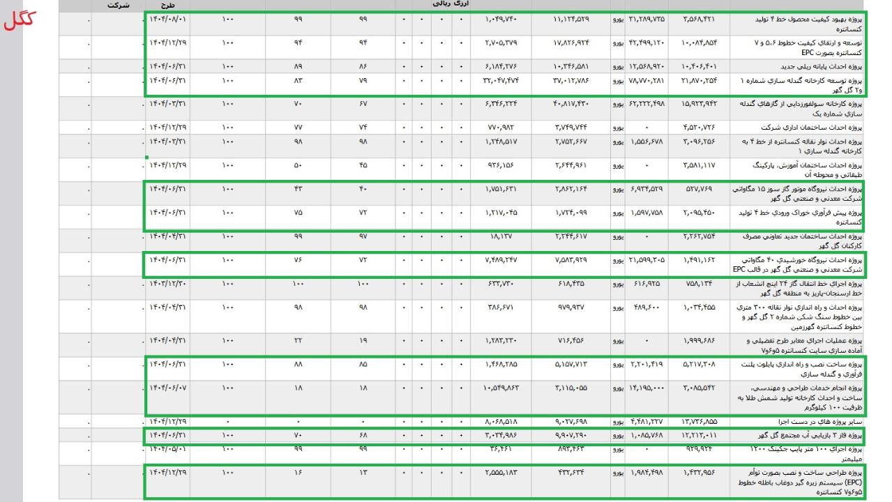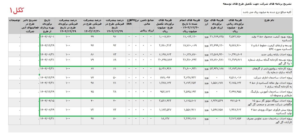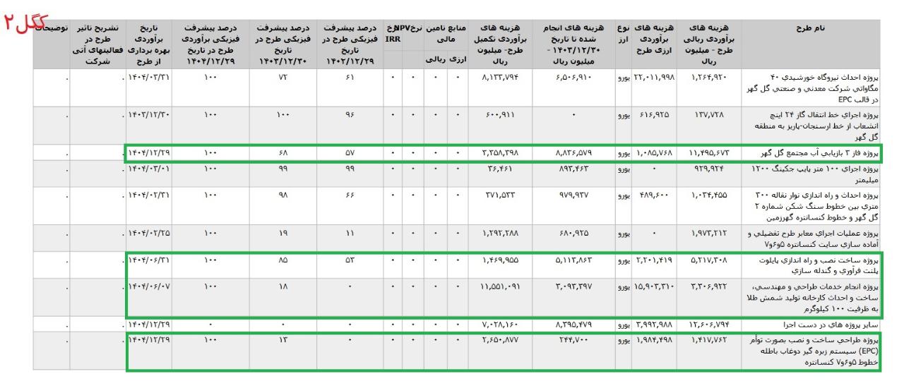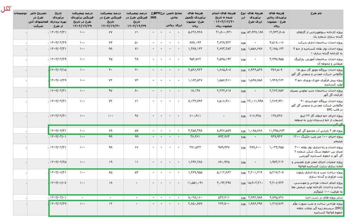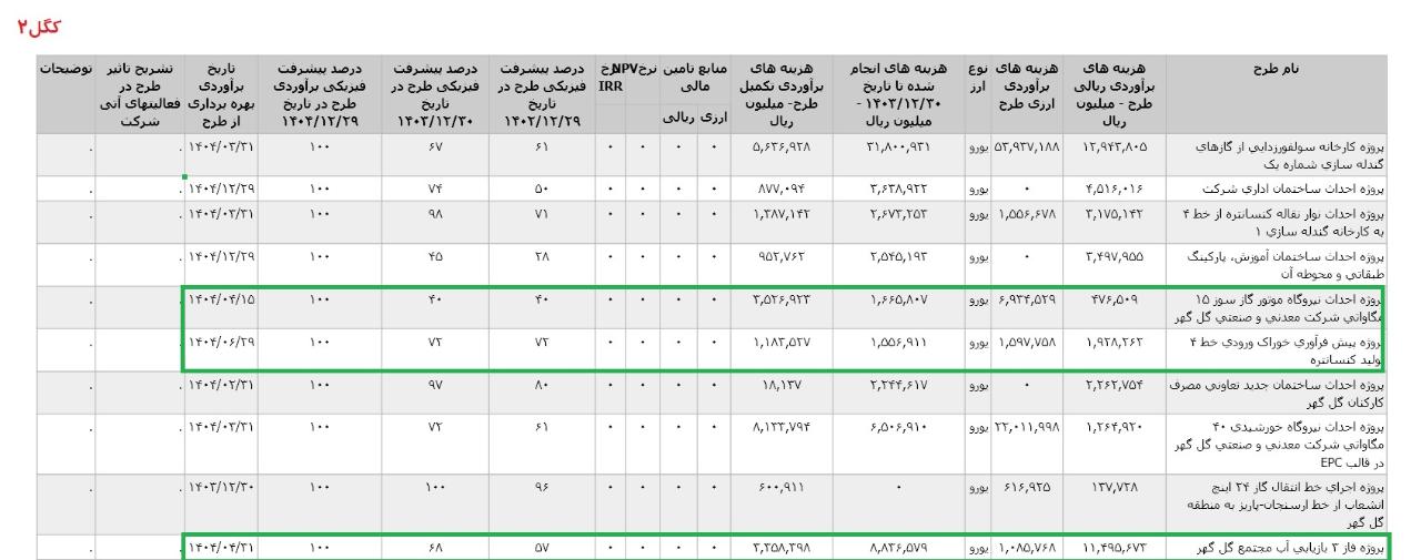 *پروژه توسعه کارخانه گندله سازي شماره ۱ و۲ گل گهر ، با هزینه ی برآوردی بهره برداری از طرح معادل 3.120 میلیارد تومان که تاریخ برآوردی بهره برداری از طرح در اردیبهشت1405 اعلام شده است.