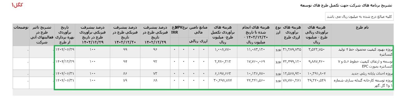 *توسعه و ارتقاي کيفيت خطوط 5،6 و ۷ کنسانتره بصورت EPC ، با هزینه ی برآوردی بهره برداری از طرح معادل 272 میلیارد تومان که تاریخ برآوردی بهره برداری از طرح در اسفند 1404 اعلام شده است.
