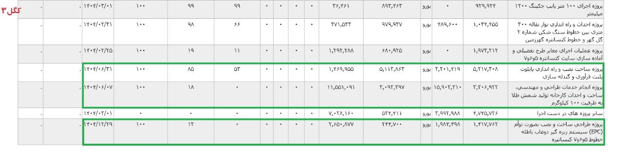 *پروژه انجام خدمات طراحي و مهندسي، ساخت و احداث کارخانه توليد شمش طلا به ظرفيت ۱۰۰ کيلوگرم ، با هزینه ی برآوردی بهره برداری از طرح معادل 1.031 میلیارد تومان که تاریخ برآوردی بهره برداری از طرح دی 1404 اعلام شده است