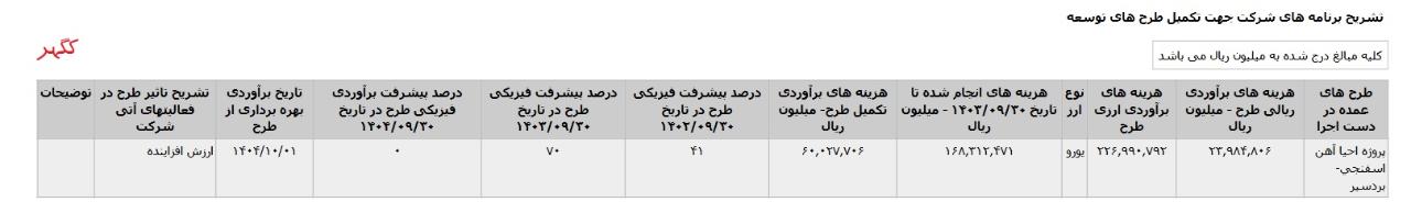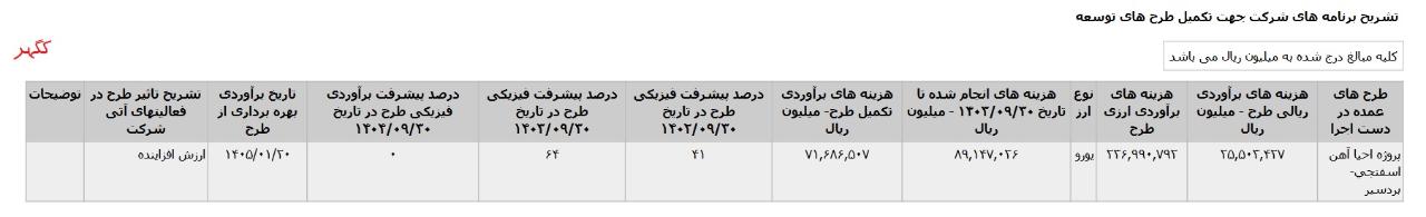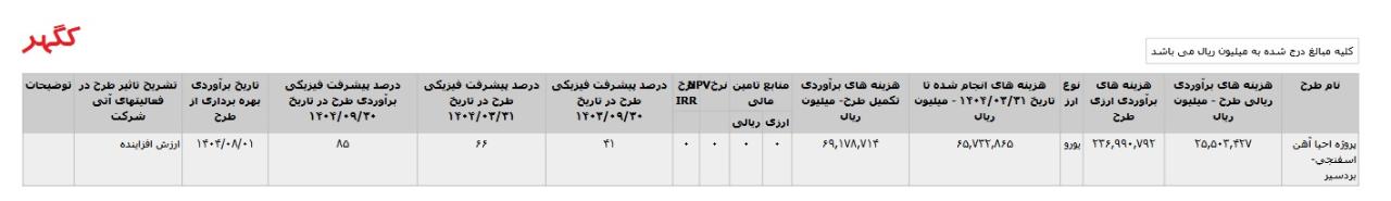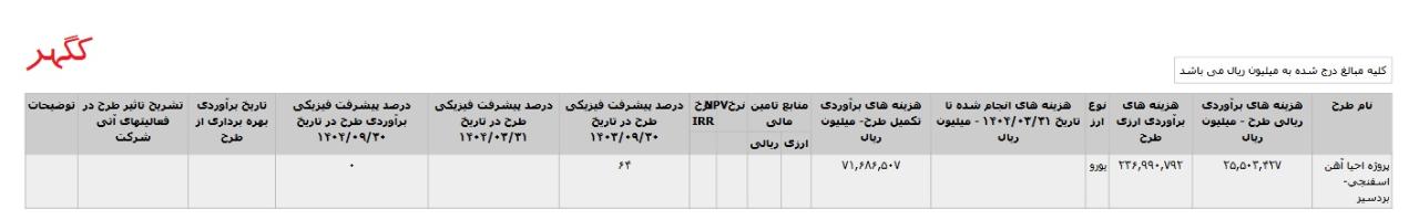 *پروژه احيا آهن اسفنجي- بردسير ،با هزینه ی برآوردی تکمیل طرح معادل 6.918 میلیارد تومان که تاریخ برآوردی بهره برداری از طرح اعلام نشده است.