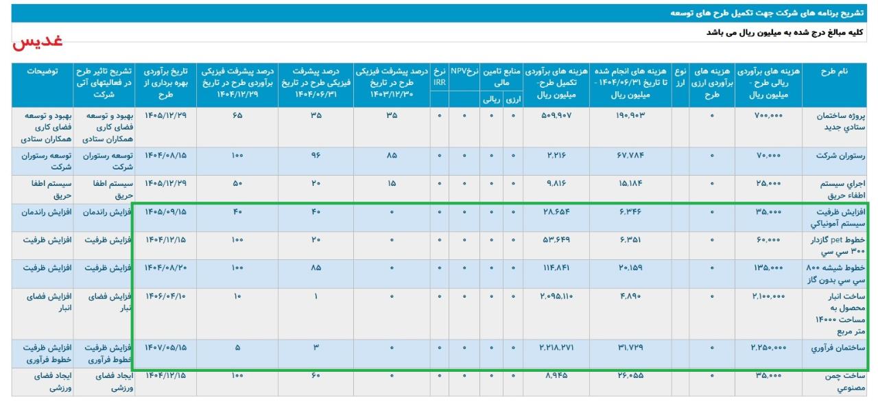 * خطوط pet گازدار ۳۰۰ سي سي ،با هزینه ی برآوردی تکمیل طرح معادل 5 میلیارد تومان که تاریخ برآوردی بهره برداری از طرح اسفند1404 اعلام شده است.