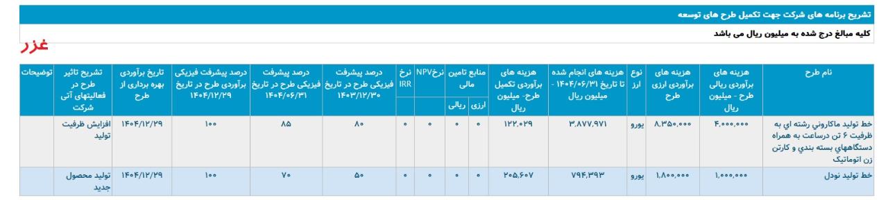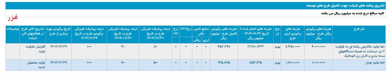 *خط تولید نودل، با هزینه ی برآوردی تکمیل طرح معادل 21 میلیارد تومان که تاریخ برآوردی بهره برداری از طرح اسفند1404 اعلام شده است.