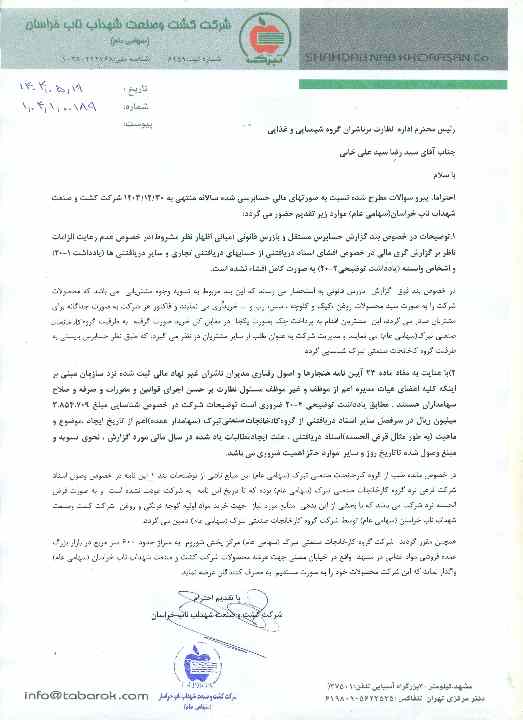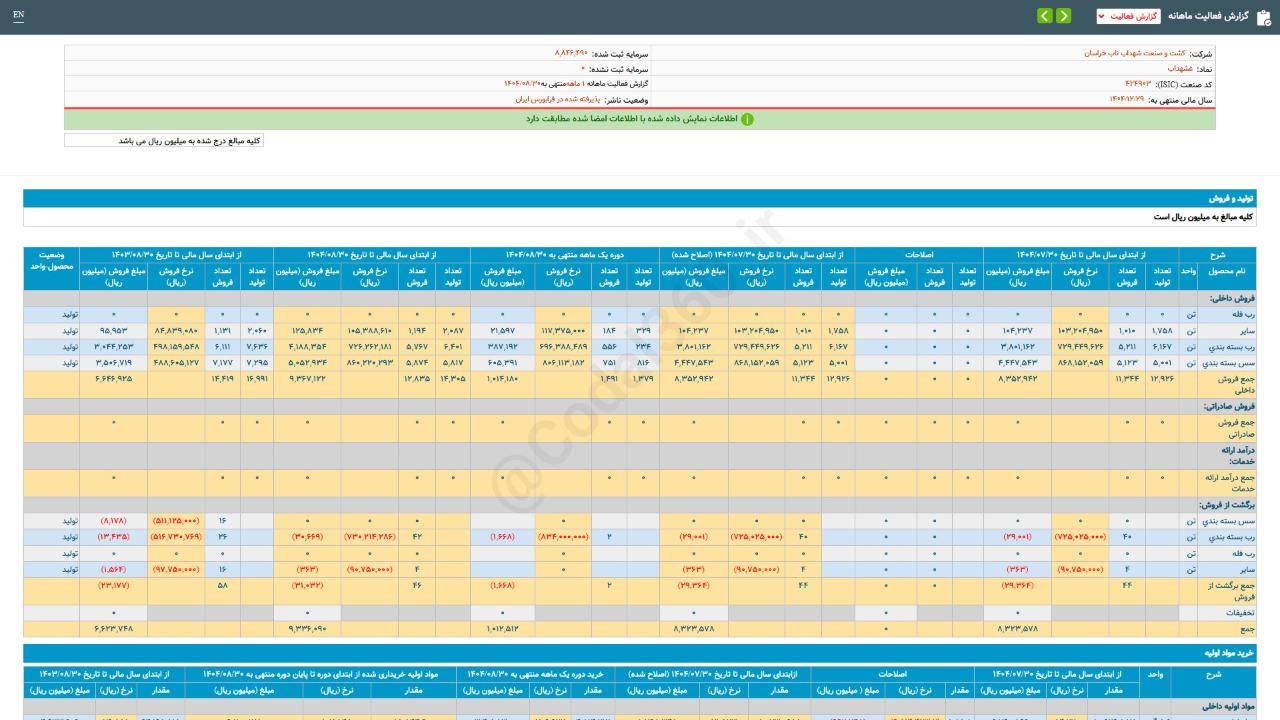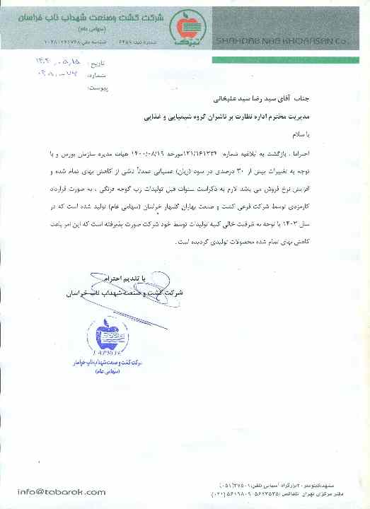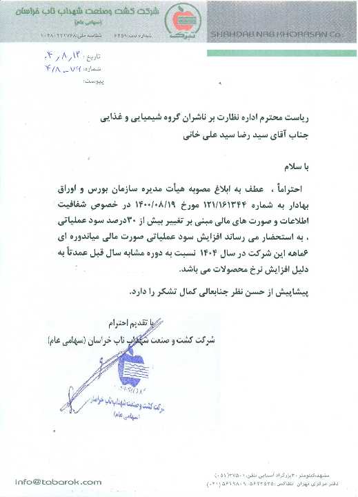 مجمع عمومی عادی سالیانه شرکت كشت و صنعت شهداب ناب خراسان روز 14 مرداد 1404 با حضور 45.41 درصد سهامداران برگزار شد و با تصویب مجمع از سود 264 ریالی ایجاد شده مبلغ 27 ریال بین سهامداران تقسیم شد.