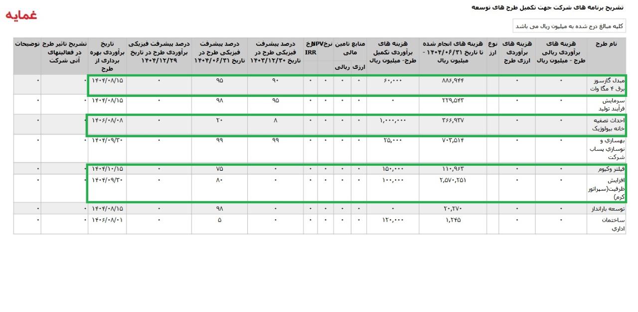 *افزایش ظرفیت سپراتور کرم ،با هزینه ی برآوردی تکمیل طرح معادل 10 میلیارد تومان که تاریخ برآوردی بهره برداری از طرح آذر 1404 اعلام شده است.