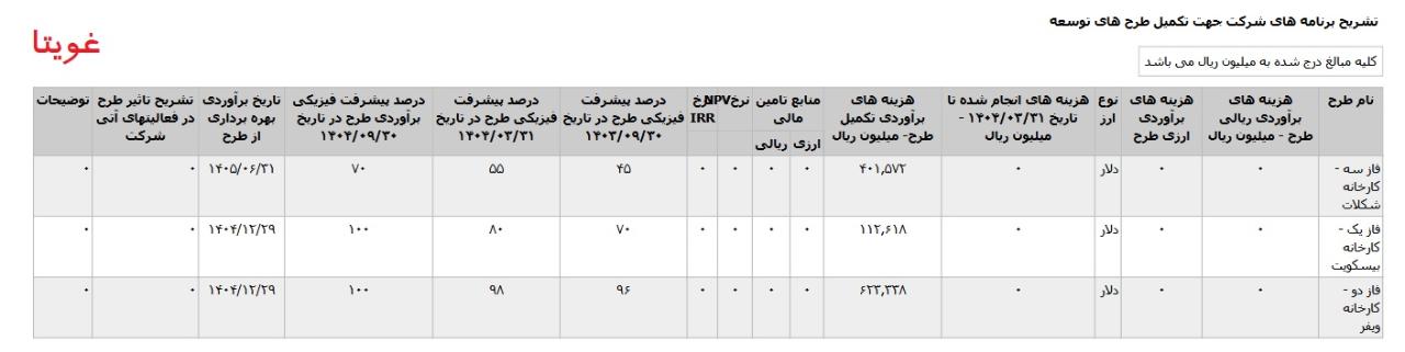 *فااز دو - کارخانه ويفر ،با هزینه ی برآوردی تکمیل طرح معادل 62 میلیارد تومان که تاریخ برآوردی بهره برداری از طرح در اسفند1404 اعلام شده است.