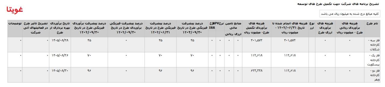 *فااز دو - کارخانه ويفر ،با هزینه ی برآوردی تکمیل طرح معادل 62 میلیارد تومان که تاریخ برآوردی بهره برداری از طرح در آبان1405 اعلام شده است.