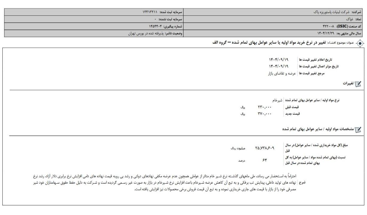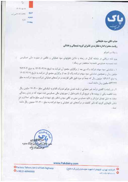 مجمع عمومی عادی سالیانه شرکت لبنيات پاك روز 31 تیر 1404 با حضور 66.64 درصد سهامداران برگزار شد و با تصویب مجمع از سود 88 ریالی ایجاد شده با توجه به زیان انباشته سودی بین سهامداران تقسیم نشد.
