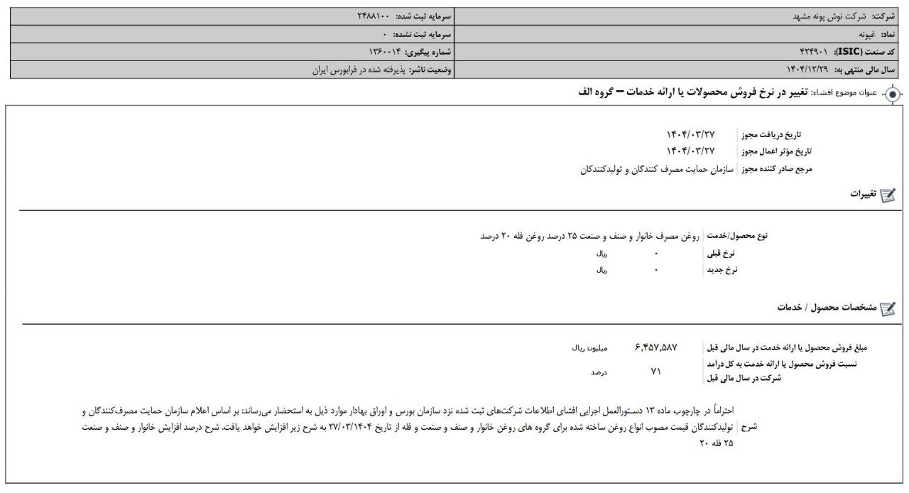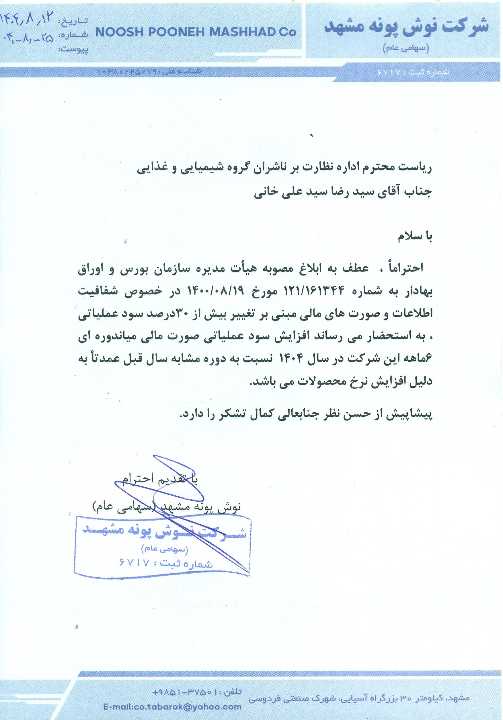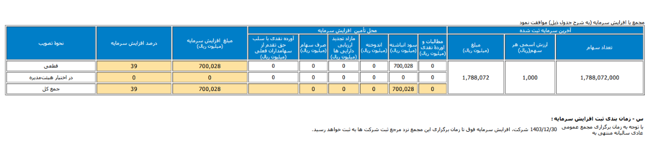 گزارش توجیهی هیئت مدیرة به منظور پیشنهادافزایش سرمایه از مبلغ 2,488,100,000,000 ریال به مبلغ 3,200,000,000,000 ریال از محل سود انباشته به منظور اصلاح ساختار مالي ، عدم خروج نقدينگي و همچنين استفاده از معافيت مالياتي بر اساس مفاد بند ث ماده 14 قانون تامين مالي مالي توليد و زير ساختها مبني بر انتقال آن بخش از سودهاي تقسيم نشده شرکتهاي پذيرفته شده در بورس و فرابورس به حساب سرمايه شرکت ها که مشمول نرخ صفر مالياتي مي باشد که در تاریخ 14040919 به تصویب هیئت مدیره رسیده و جهت اظهارنظر به حسابرس و بازرس قانونی ارسال شده