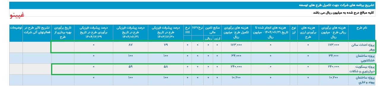 * پروژه احداث سالن ویفر ،با هزینه ی برآوردی تکمیل طرح معادل 17 میلیارد تومان که تاریخ برآوردی بهره برداری از طرح اعلام نشده است.