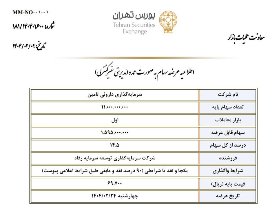 شرکت کارگزاری بانک مسکن طی نامه ای که روز 26 مرداد به سازمان فرابورس داده اعلام کرده تعداد 150 میلیون سهم معادل 5 درصد سهام عمده مدیریتی غیرکنترلی شرکت بیمه پردیس در قیمت پایه قیمت پایه هر سهم 2600 ریال یا 125 درصد قیمت پایانی روز قبل از عرضه هرکدام بیشتر باشد. در روز 12 شهریور 1404 به نمایندگی از جمعی از شرکت سرمایه گذاری تامین آتیه سپهر قرن عرضه خواهد شد.بصورت نقد . قیمت فعلی سهم در روز 11 شهریور ماه 1034 ریال میباشد.