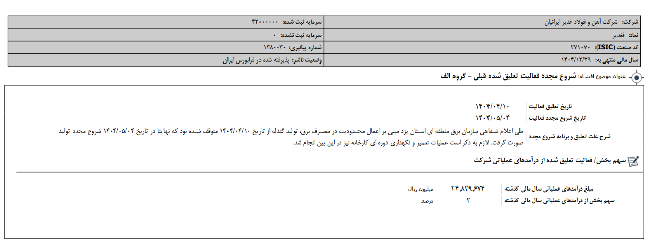 ▪️ شرکت آهن و فولاد غدیر ایرانیان در دوره 6 ماهه منتهی به 14040631 ضمن ثبت افزایش سرمایه 20 درصد، در این دوره به ازای هر سهم 354 ریال سود محقق کرده است.