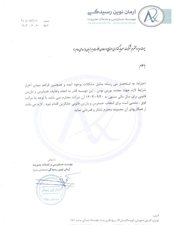مجمع عمومی عادی سالیانه شرکت گروه سرمايه گذاري صنايع و معادن فلات ايرانيان روز 27 اردیبهشت 1404 با حضور 55.81 درصد سهامداران برگزار شد و با تصویب مجمع از آنجائیکه در سال الی به ازای هر سهم 111 ریال زیان شناسایی کرد سودی بین سهامداران تقسیم نکرد.