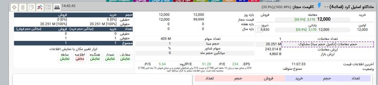 به اطلاع ميرساند؛ پيرو اطلاعيه شماره 9403الف04 مورخ 14040625 اين شرکت، تعداد 20,251,158 سهم معادل 5 درصد، سهام غيرمديريتي شركت ماداکتو استيل کرد سهامي عام در نماد معاملاتي فماك4 بطور عمده و نقد با قيمت پايه هر سهم معادل 12,000 ريال ، امروز چهارشنبه مورخ 14040702 از طريق بازار نوآفرين فرابورس ايران، مورد عرضه قرار گرفت که مورد معامله هم قرار گرفت