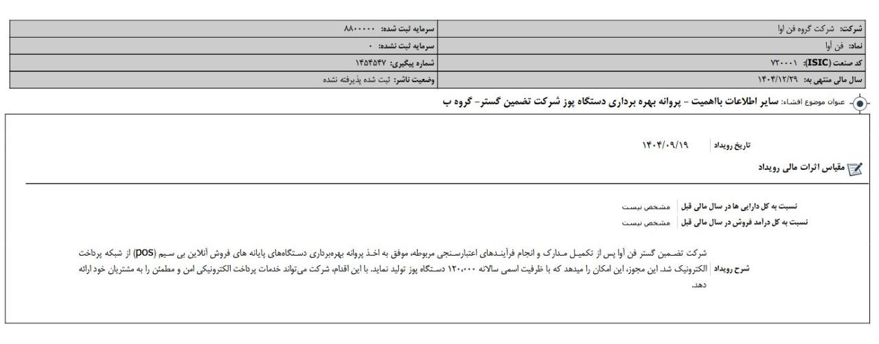 مجمع عمومی عادی سالیانه شرکت گروه فن اوا روز 30 تیر 1404 با حضور 91.78 درصد سهامداران برگزار شد و با تصویب مجمع از سود 107 ریالی ایجاد شده مبلغ 11 ریال بین سهامداران تقسیم شد.
