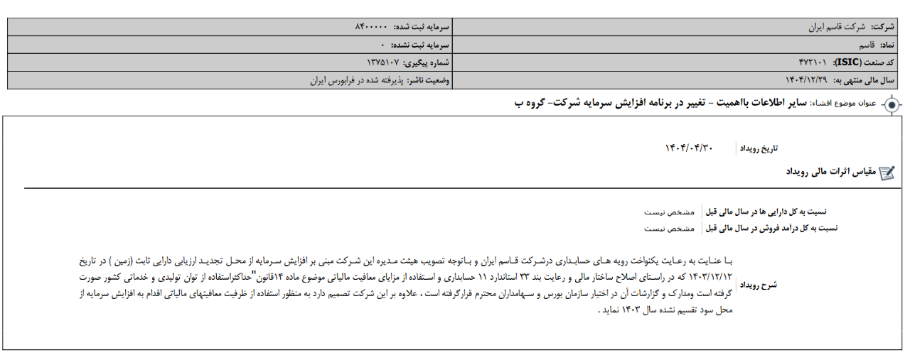 مجمع عمومی عادی سالیانه شرکت قاسم ایران روز 3 خرداد 1404 با حضور 83.05 درصد سهامداران برگزار شد و با تصویب مجمع از سود 671 ریالی ایجاد شده مبلغ 400 ریال بین سهامداران تقسیم شد.