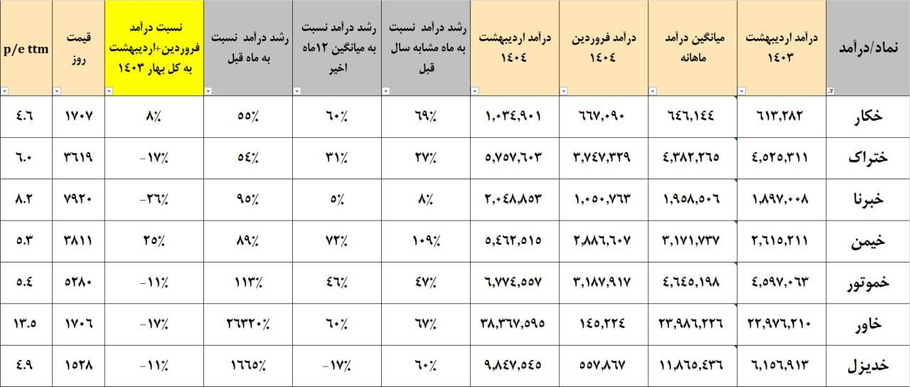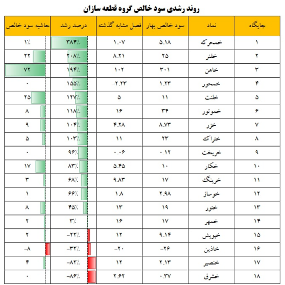 نمادهای خکار، خبرنا، خیمن، خرینگ، خشرق، خزامیا، خدیزل، فنر و خلنت نسبت به تابستان به طور متوسط رشد درآمد 76درصد داشتند ضمن اینکه نسبت به بهار نیز عمدتا به شکل قابل توجهی رشد درآمد را ثبت کردند.
