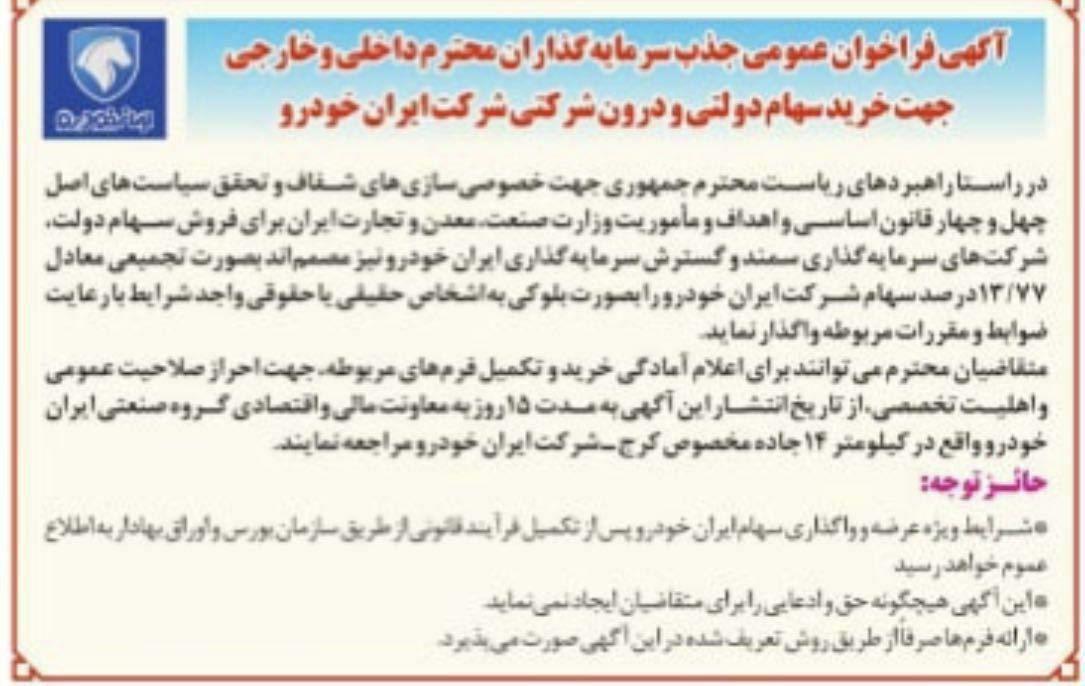 آگهی رسمی روزنامه فراخوان عمومی سرمایه گذاری داخلی و خارجی جهت خرید سهام دولت و درون شرکتی ایران خودرو