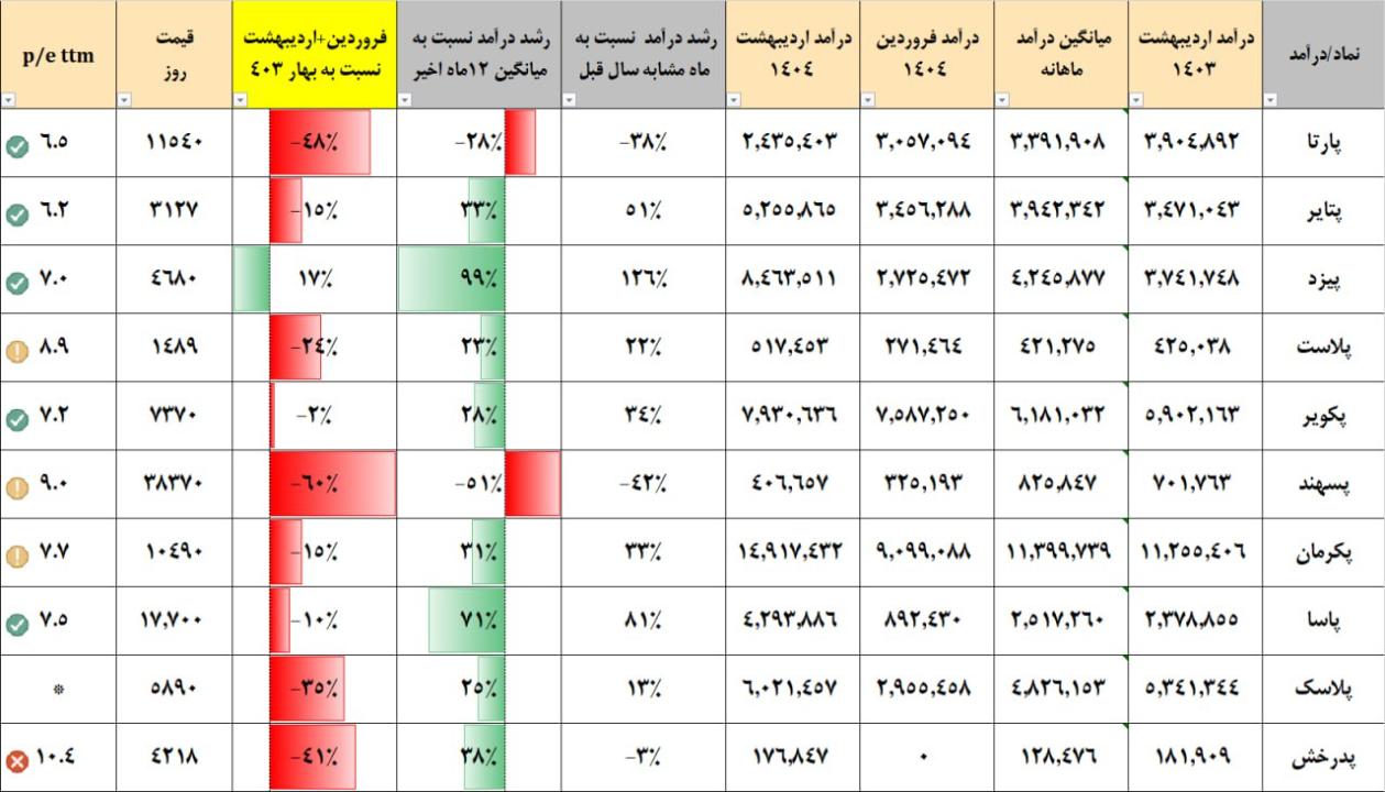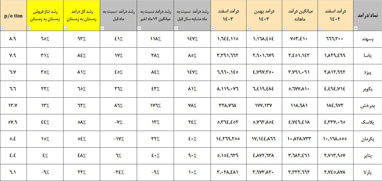 نمادهای پیزد، پکویر، پتایر، پاسا، پکرمان در مجموع فروردین و اردیبهشت 1404 تقریبا به اندازه کل بهار 1403 درآمد کسب کرده اند. بر این اساس درآمد آنها با گزارش فصل بهار به شکل TTM رشد می کند.