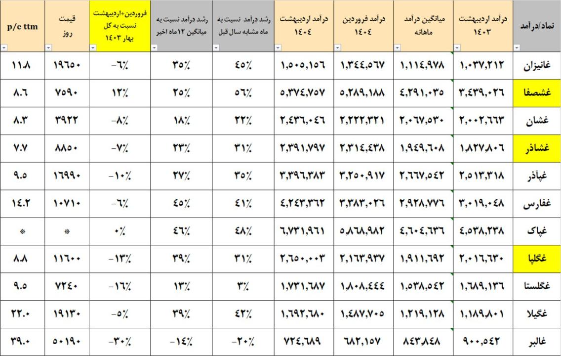 شتاب رشد درآمد گروه در زمان حذف دلار 4200 تومانی بود و پس ازان به حالت خنثی درآمده است. افزایش قیمت شیرخام در بهار، حاشیه سود صنعت را کاهش داد اما در تابستان بهبود نسبی داشت.