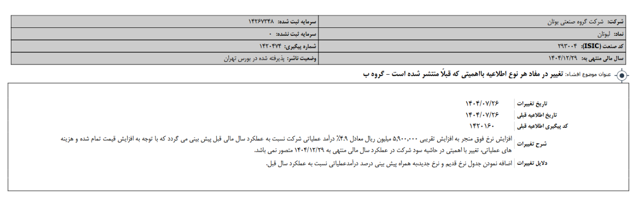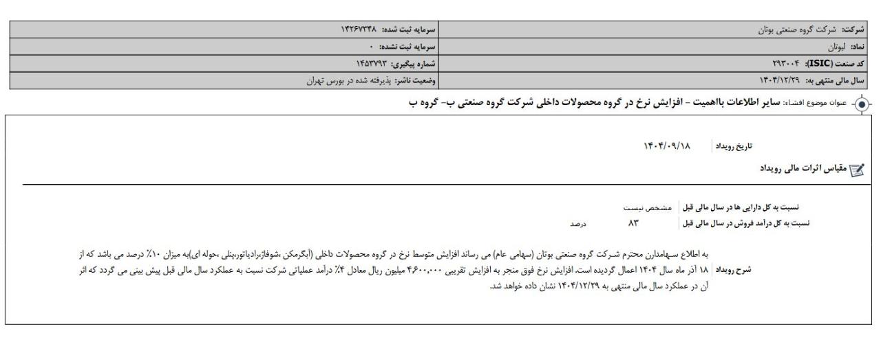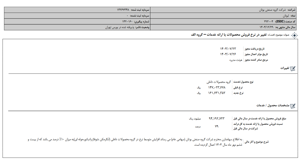 شرح موضوع و آثار مالی به اطلاع سهامدارن محترم شرکت گروه صنعتی بوتان سهامی عام می رساند افزایش متوسط نرخ در گروه محصولات داخلی آبگرمکن ،شوفاژ،رادیاتور،حوله ایبه میزان 10% درصد می باشد که از بیست و ششم مهر ماه سال 1404 اعمال گردیده است.