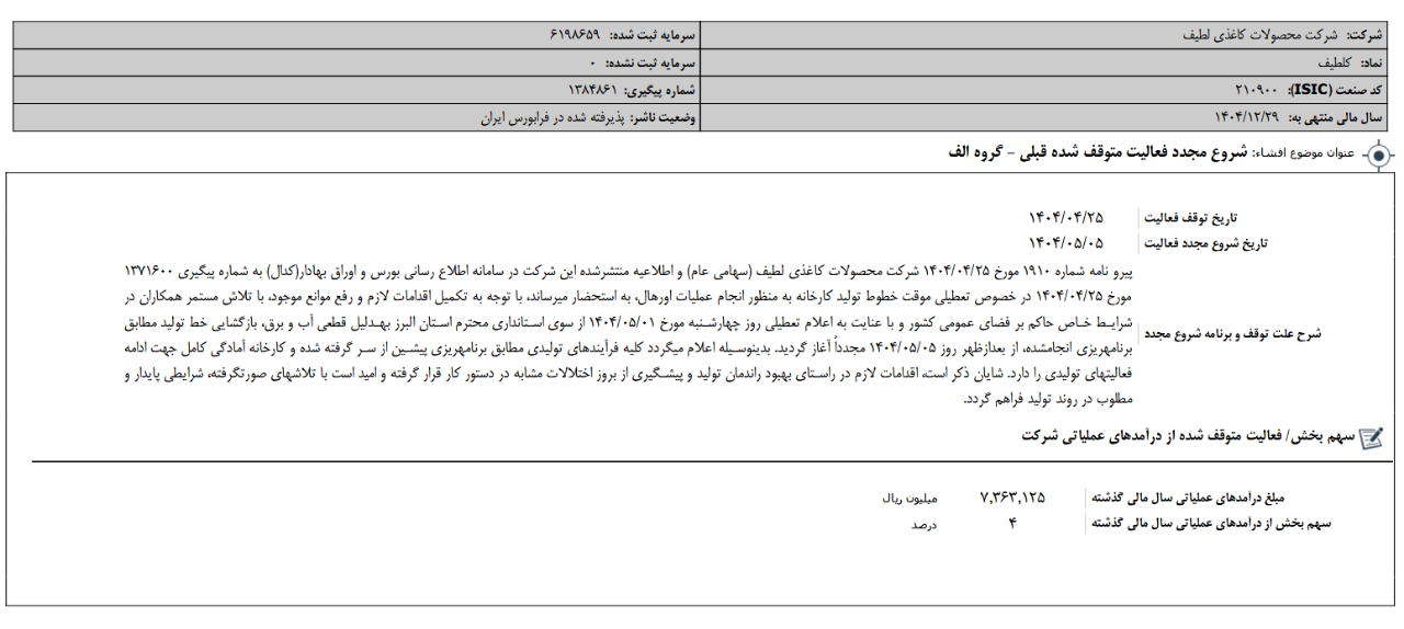 سه فروشنده محصولات كاغذي لطيف در این معامله بلوکی حقیقی بودند. دو خریدار این معامله حقوقی بودند. قیمت هر سهم 2441 ریال بود.