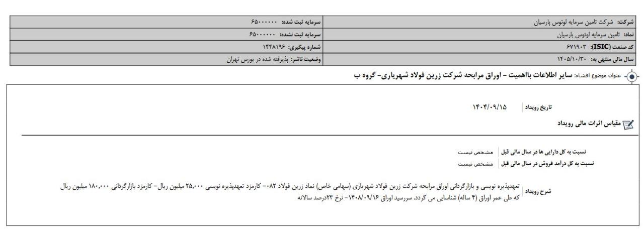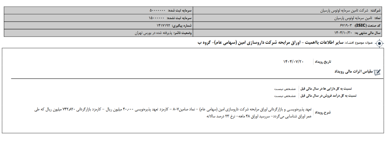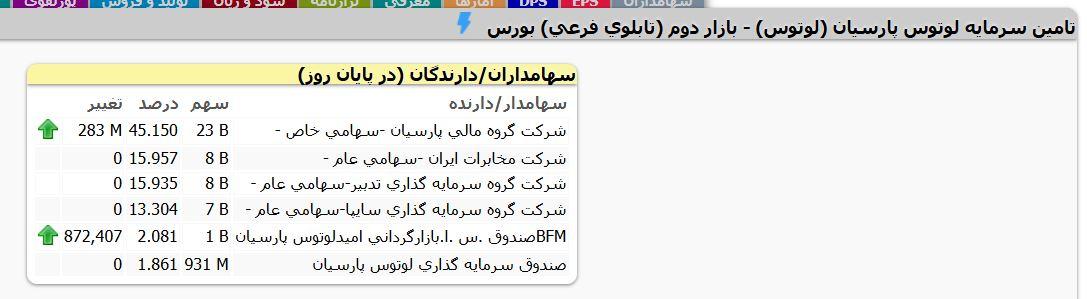 در نماد لوتوس امروز 7 آبان 1404 تعداد 283 میلیون و 280 هزار سهم به صورت بلوکی معامله گردید فروشنده و خریدار تامين سرمايه لوتوس پارسيان در این معامله بلوکی حقوقی بود.قیمت هر سهم 2186 ریال بود.