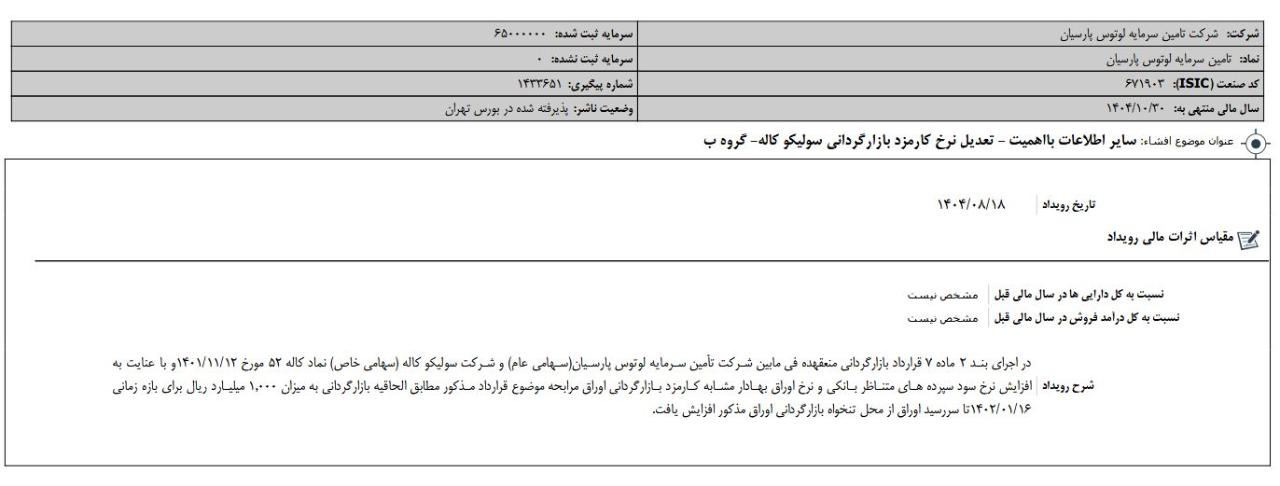 در نماد لوتوس امروز 19 مهر 1404 تعداد 90 میلیون سهم به صورت بلوکی معامله گردید فروشنده و خریدار تامين سرمايه لوتوس پارسيان در این معامله بلوکی حقوقی بود.قیمت هر سهم 2201 ریال بود.