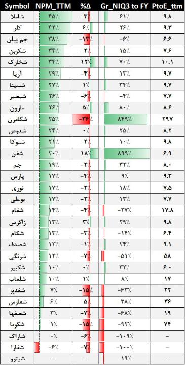 از 32 شرکت موجود در این گروه، 20 شرکت رشد سودخالص داشته اند که #شفن، #شگامرن و #مارون بیشترین نرخ رشد را ثبت کرده اند. همچنین فقط شرکتهای شفن، شخارک، کلر، مارون، زاگرس، شلعاب و شسینا توانسته اند حاشیه سود خالص را نسبت به دوره قبل 1 تا 18درصد بهبود ببخشند. ، شفن و مارون شرکتهایی هستند که رشد سودآوری بالا و نسبت قیمت به سود پایین دارد.