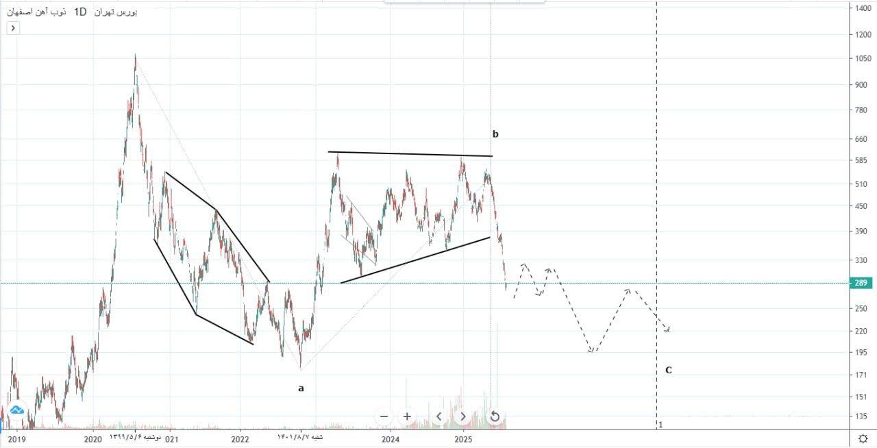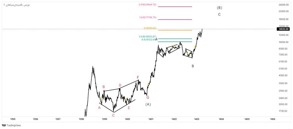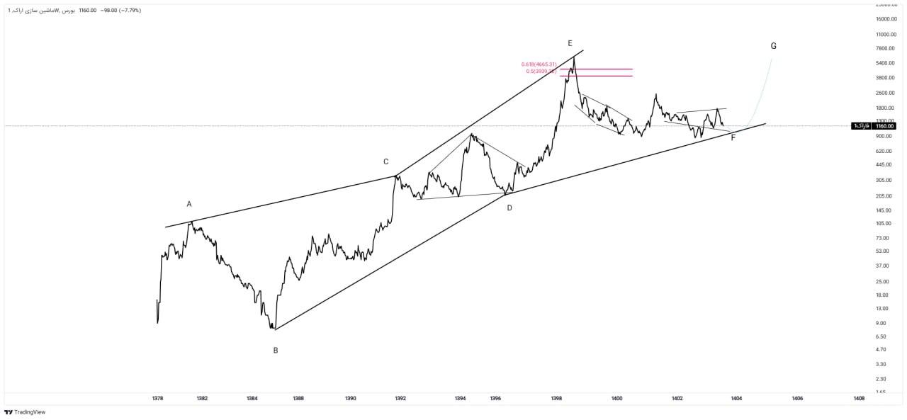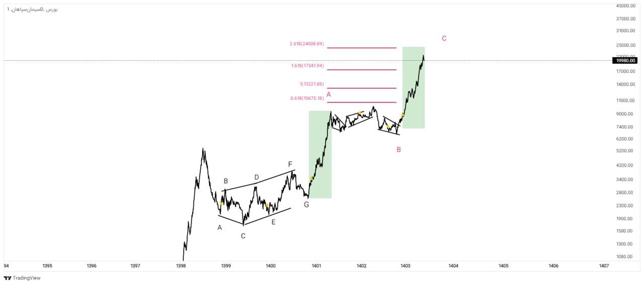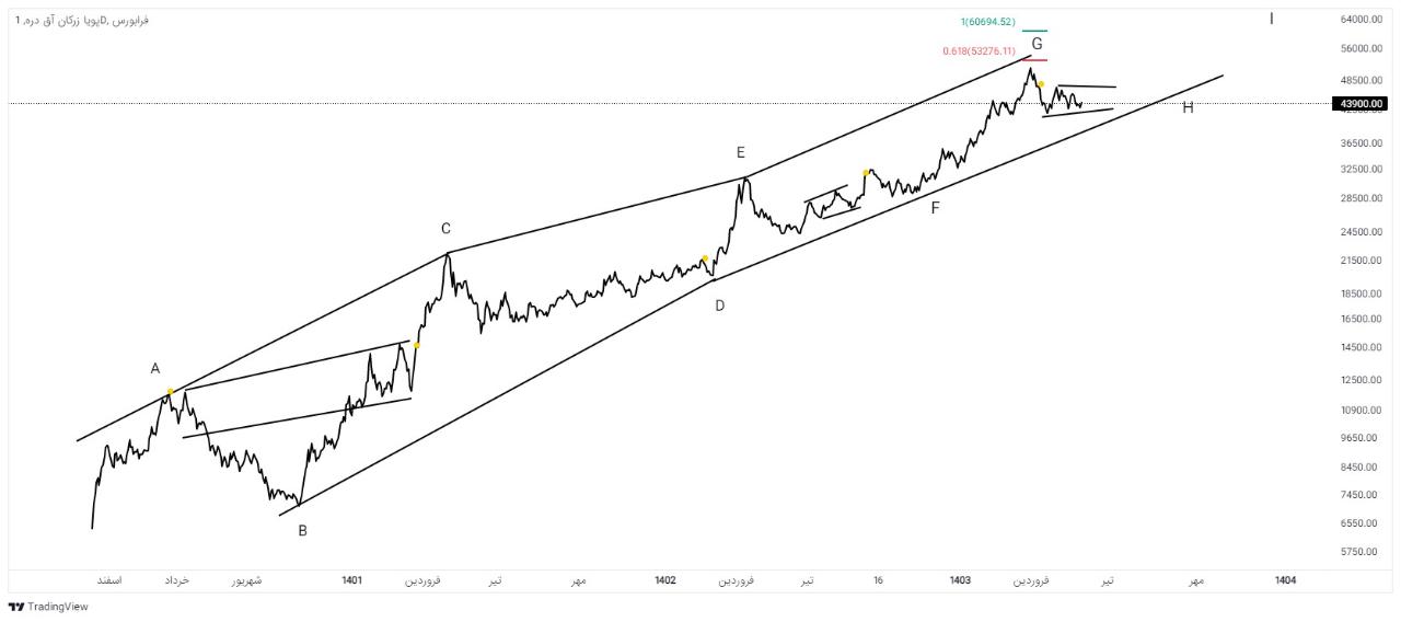 ABCDEFGHI سمیتریک مدنظر است که از قله فروردین ۱۴۰۴ در ۵۱۴۰ تومان ریزشی در قالب لگ H در حال تکمیل است که به نظر زمانبر بوده و هنوز ادامه دارد. لذا هر رشدی نوسان برای شکل گیری ریز موجهای الگو است و فعلا بعید است سقف تاریخی شکسته شود.