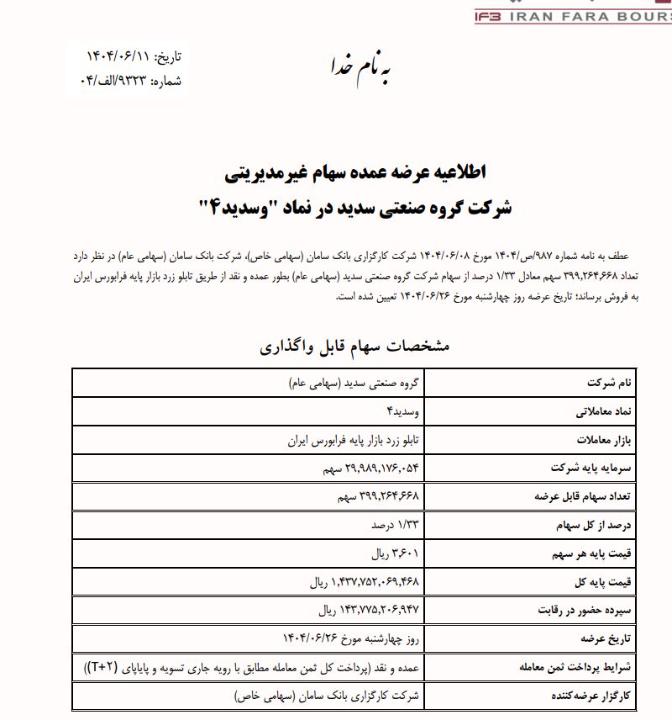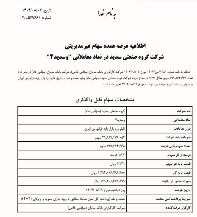 شرکت کارگزاری بانک سامان طی نامه ای که روز 3 آبان به سازمان فرابورس داده اعلام کرده مقدار 399 میلیون و 264 هزار و 668 سهم معادل 1.33 درصد سهام غیرمدیریتی شرکت گروه صنعتی سدید در قیمت پایه 3241 ریال در روز 19 آبان 1404 به نمایندگی از بانک سامان عرضه خواهد شد.بصورت نقد . قیمت فعلی سهم در روز 12 شهریور ماه 1164 ریال میباشد.