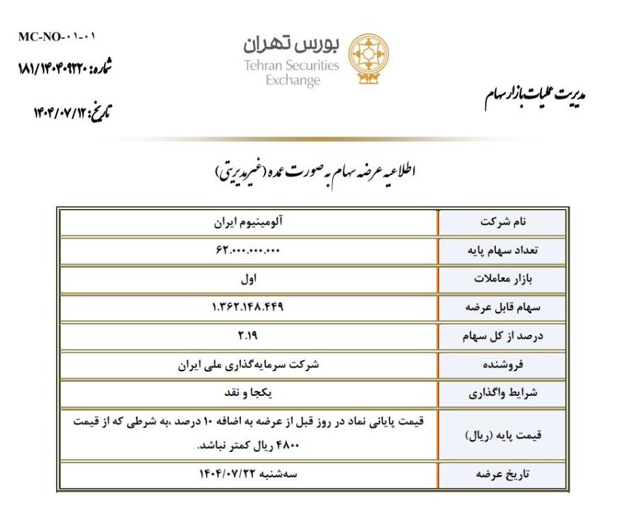 شرکت کارگزاری سرمایه گذاری ملی ایران طی نامه ای که روز 9 مهر به سازمان بورس داده اعلام کرده مقدار یک میلیارد و 362 میلیون و 148 هزار و 449 سهم معادل 2.19 درصد سهام غیرمدیریتی شرکت آلومینیوم ایران در قیمت پایه قيمت پايانی نماد در روز قبل از عرضه به اضافه 10 درصد ، به شرطی که از قيمت 4800 ريال کمتر نباشد. در روز 22 مهر 1404 به نمایندگی از شرکت سرمایه گذاری ملی ایران عرضه خواهد شد.بصورت نقد! قیمت فعلی سهم در روز 14 مهر 4361 ریال میباشد.