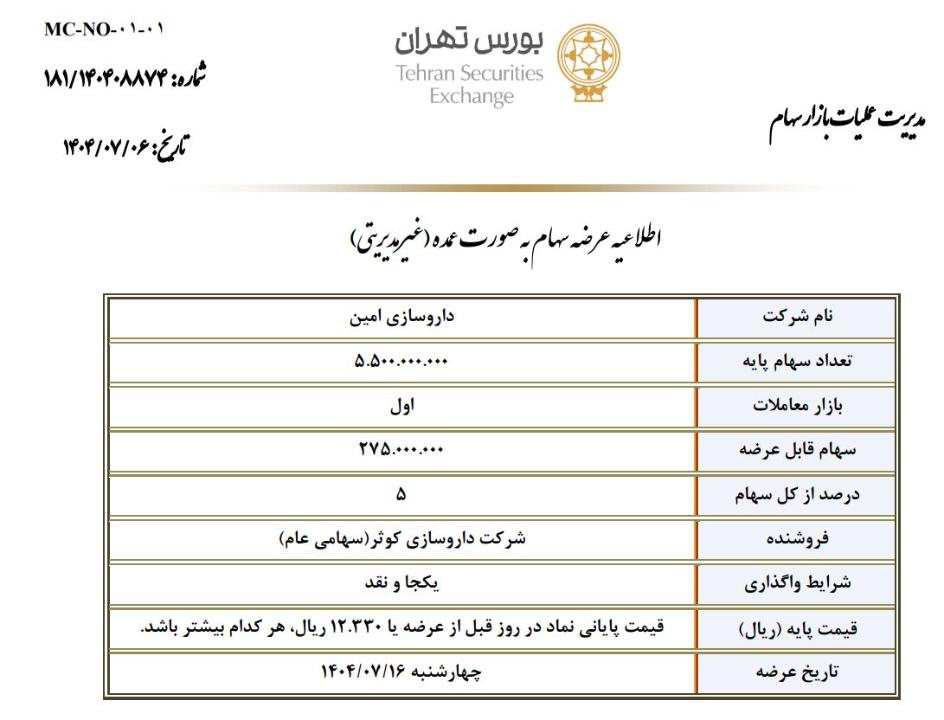 شرکت کارگزاری توسعه معاملات کیان طی نامه ای که روز 6 مهر به سازمان بورس داده اعلام کرده مقدار 275 میلیون سهم معادل 5 درصد سهام غیرمدیریتی شرکت داروسازی امین در قیمت پایه قيمت پایانی نماد در روز قبل از عرضه یا 12.330 ریال، هر کدام بيشتر باشد. در روز 16 مهر 1404 به نمایندگی از شرکت داروسازی کوثر عرضه خواهد شد.بصورت نقد! قیمت فعلی سهم در روز 14 مهر 12170 ریال میباشد.