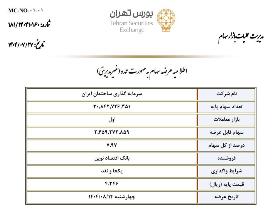 شرکت کارگزاری تامین سرمایه نوین طی نامه ای که روز 27 مهر به سازمان بورس داده اعلام کرده مقدار 2 میلیارد و 459 میلیون و 272 هزار و 859 سهم معادل 7.97 درصد سهام غیرمدیریتی شرکت سرمايه گذاري ساختمان ايران در قیمت پایه 4346 ریال در روز 14 آبان 1404 به نمایندگی از بانک اقتصاد نوین عرضه خواهد شد.بصورت نقد! قیمت فعلی سهم در روز 29 مهرماه 1192 ریال میباشد.