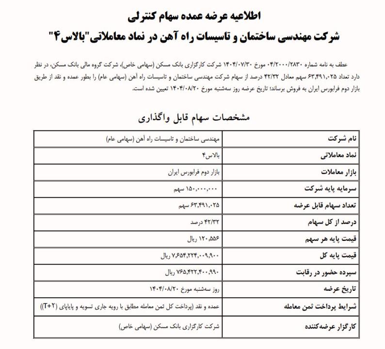 شرکت کارگزاری بانک مسکن طی نامه ای که روز 30 مهربه سازمان فرابورس داده اعلام کرده مقدار 63 میلیون و 491 هزار و 25 سهم معادل 42.32 درصد سهام مدیریتی کنترلی شرکت مهندسي ساختمان تاسيسات راه آهن در قیمت پایه 120556 ریال در روز 20 آبان 1404 به نمایندگی از شرکت گروه مالی بانک مسکن عرضه خواهد شد.بصورت نقد! قیمت فعلی سهم در روز 3 آبان 44450 ریال میباشد.