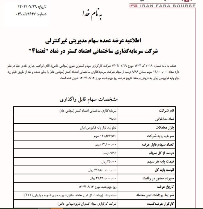 شرکت کارگزاری سهام گستران شرق طی نامه ای که روز 29 مهر به سازمان فرابورس داده اعلام کرده مقدار 14 میلیون و 100 هزار معادل 9.96 درصد سهام مدیریتی غیرکنترلی شرکت س. ساختماني اعتماد گستر در قیمت پایه 35000 ریال در روز 14 آبان 1404 به نمایندگی از 0000 عرضه خواهد شد.بصورت نقد قیمت فعلی سهم در روز 3 آبان 26150 ریال میباشد.