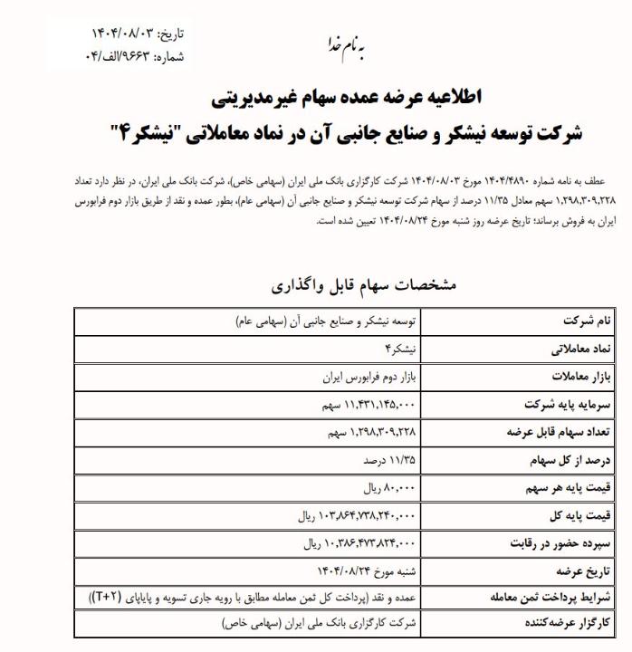 #اطلاعیه_عرضه_عمده #غیرمدیریتی #نیشکر #کارگزاری_بانک_ملی_ایران #عرضه_عمده #نقد #نیشکر4 #بانک_ملی_ایران