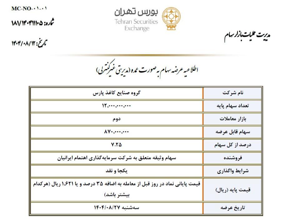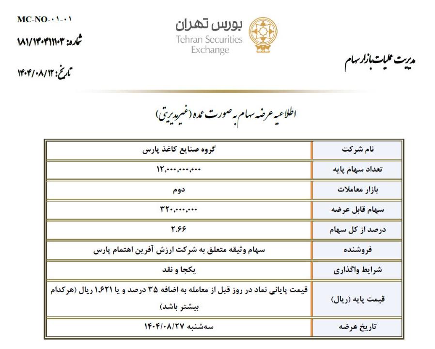 شرکت کارگزاری بانک سامان طی نامه ای که روز 12 آبان به سازمان بورس داده اعلام کرده مقدار 320 میلیون سهم معادل 2.66 درصد سهام غیرمدیریتی شرکت گروه صنایع کاغذ پارس در قیمت پایه قیمت پاياني روز قبل از عرضه به اضافه 35 درصد و یا 1621 ريال هر کدام بیشتر باشد. در روز 27 آبان 1404 به نمایندگی از سهام وثیقه متعلق به شرکت شرکت ارزش آفرين اهتمام پارس عرضه خواهد شد.بصورت نقد! قیمت فعلی سهم در روز 18 آبان ماه 1159 ریال میباشد.